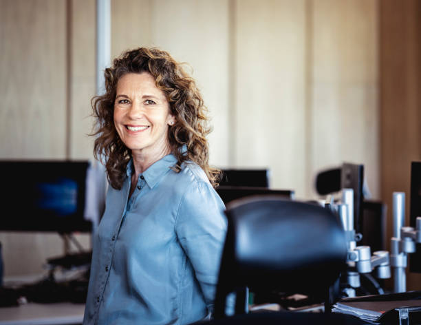 Portrait of smiling mature businesswoman. Female executive is looking away. She is standing at office.